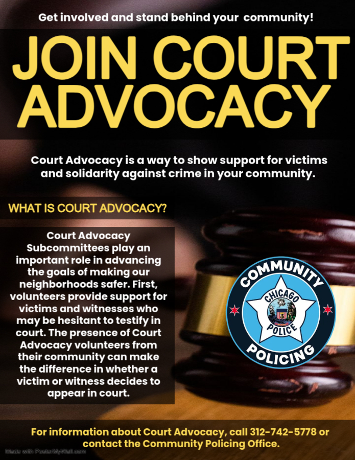 This program consist of individuals who want to support their community by following cases/arrests made within their districts. The group meets via Zoom (until further notice), the first Tuesday of every other month to discuss cases (both New and Old cases). For the cases discussed, CPD provides the group with information regarding each case, where it happened, what happened, and when/where the court case will be held for the offender in custody. The Court Advocates can pick and choose whichever case interest them and which cases they want to show their presence for. By attending these cases, the Advocates are showing their support for the victims and the community in which it occurred. That presence makes a statement that they are standing up for their community and that they don’t want this activity in their neighborhood. We hope that when the judge sees this type of support from citizens that they will take the cases and sentencing methods more serious.